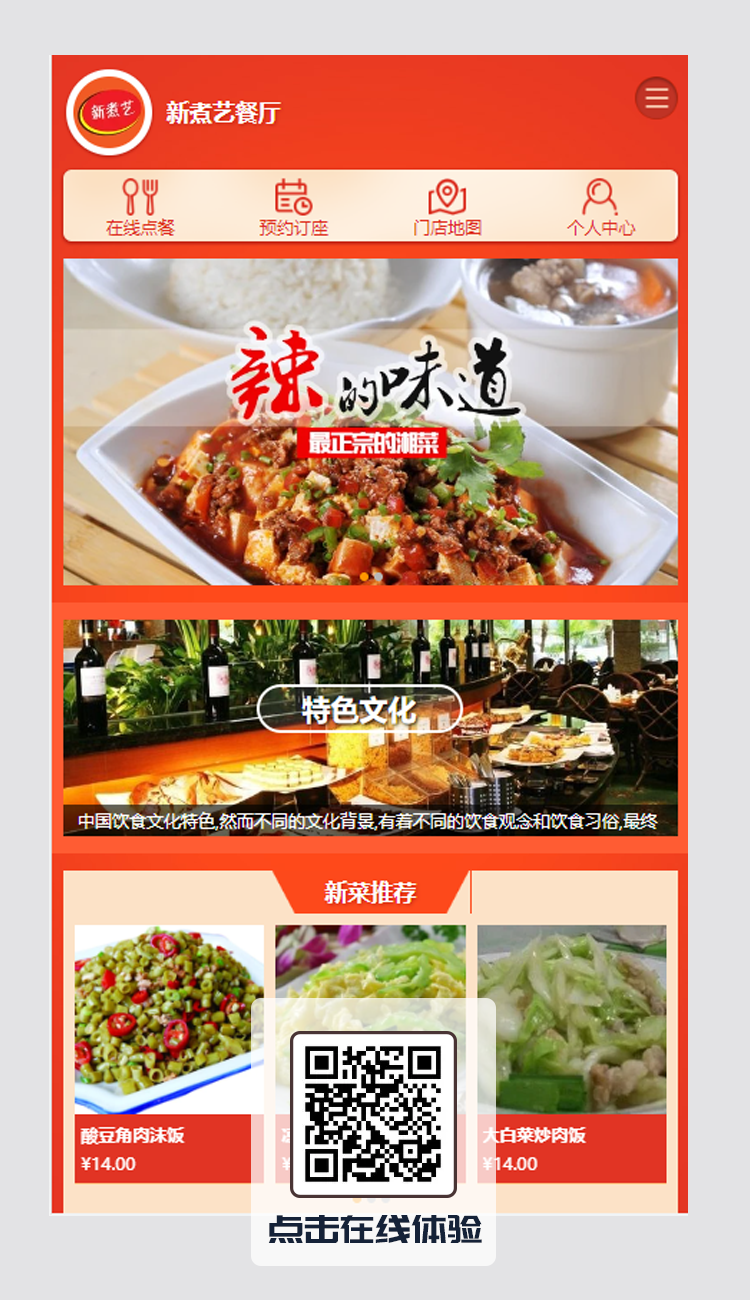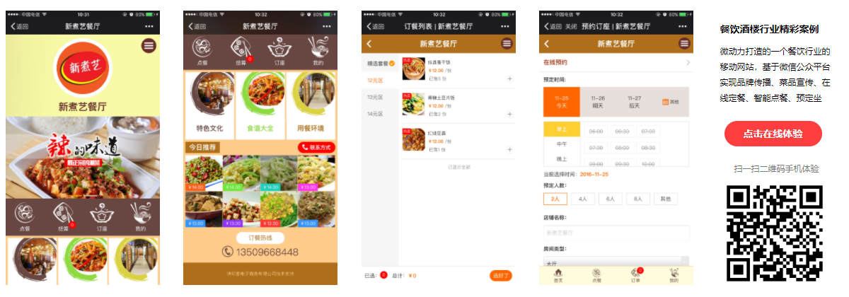 智慧云码打造的一个餐饮行业的移动网站,基于微信公众平台实现品牌传播、菜品宣传、在线定餐、智能点餐、预定坐席、粉丝到店、口碑营销,与粉丝互动等全自主的营销手段,帮助餐饮企业让粉丝转为门店客人,让门店客人转为长期客户!解决餐饮企业流程效率问题,提升客户体验,提高经济效益。
